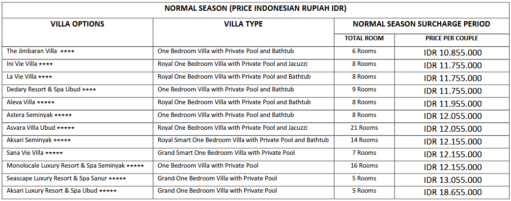 PRICE PER COUPLE NORMAL SEASON (2 Participants)